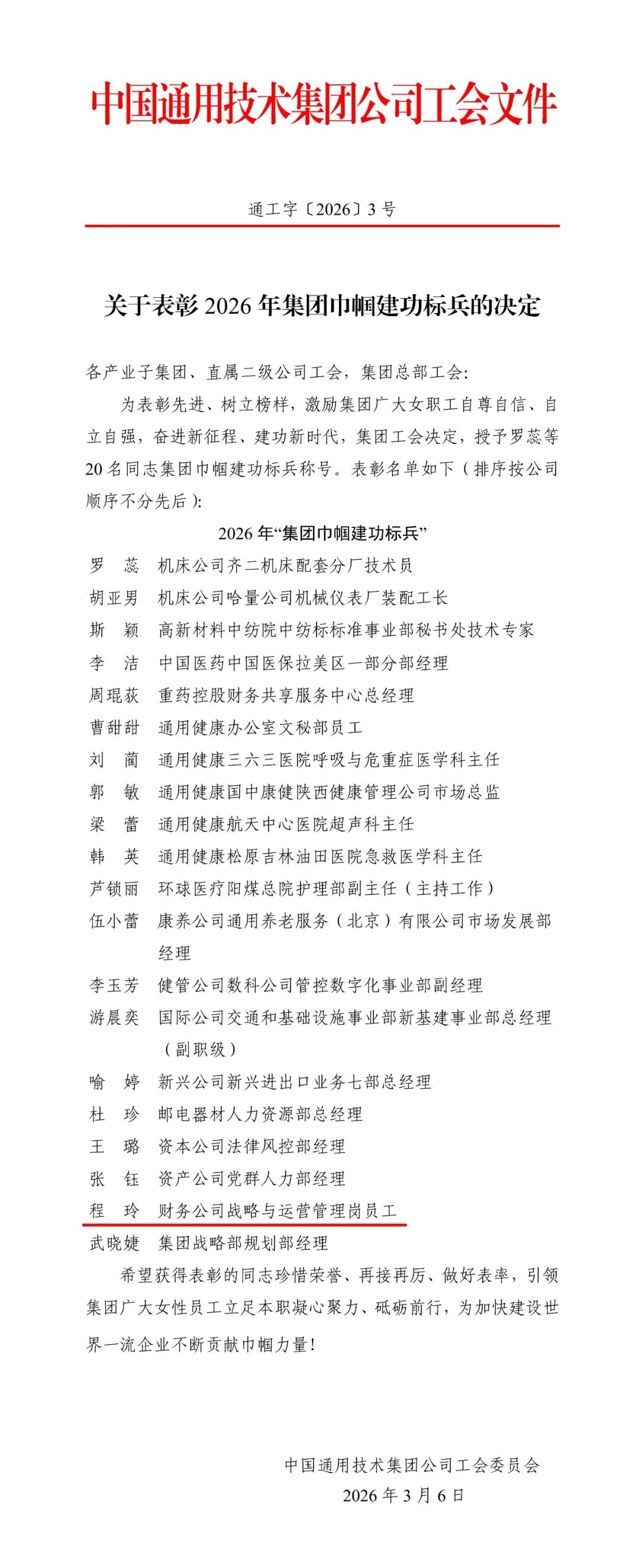 礼赞巾帼风采,树立先进典范。为引领广大女职工立足岗位、实干笃行,积极投身“十五五”建设与世界一流企业发展征程,通用技术集团工会授予20名同志集团巾帼建功标兵称号。通用技术财务公司办公室程玲同志凭借优异表现荣获表彰。