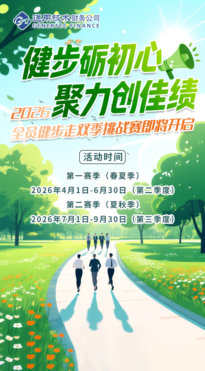 为深入贯彻全民健身国家战略,扎实推进健康企业建设,丰富员工文化生活、激发团队活力,通用技术财务公司工会于2026年4月至9月组织开展“健步砺初心,聚力创佳绩”全员健步走双季挑战赛,比赛分为春夏季与夏秋季两个独立赛季,鼓励员工在工作之余走出工位、迈开步伐、舒缓身心、提振精神。